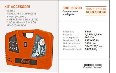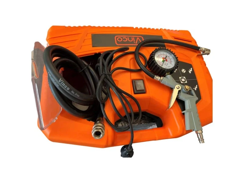 The Vinco MOD. AZZURRO 230V Air Compressor is a versatile unit for inflating tires, balloons, and mattresses. Includes a pressure gauge, rubber hose, and assorted nozzles. Ideal for home, garage, and vehicle maintenance.